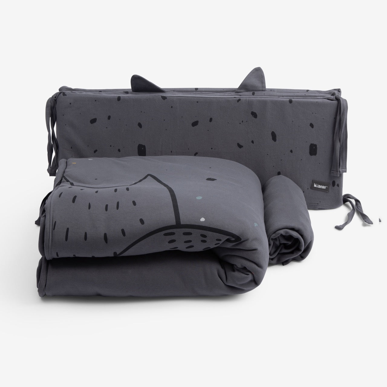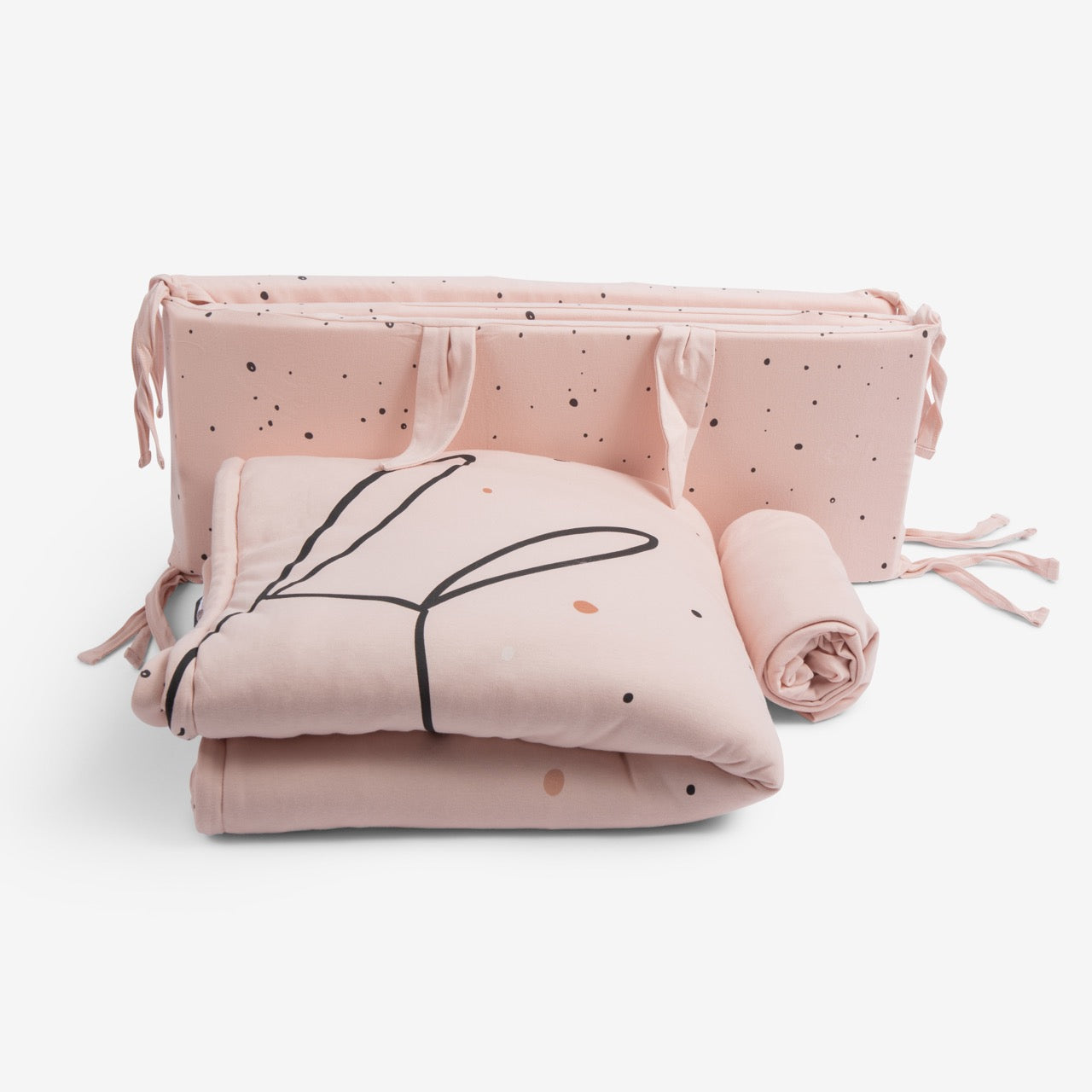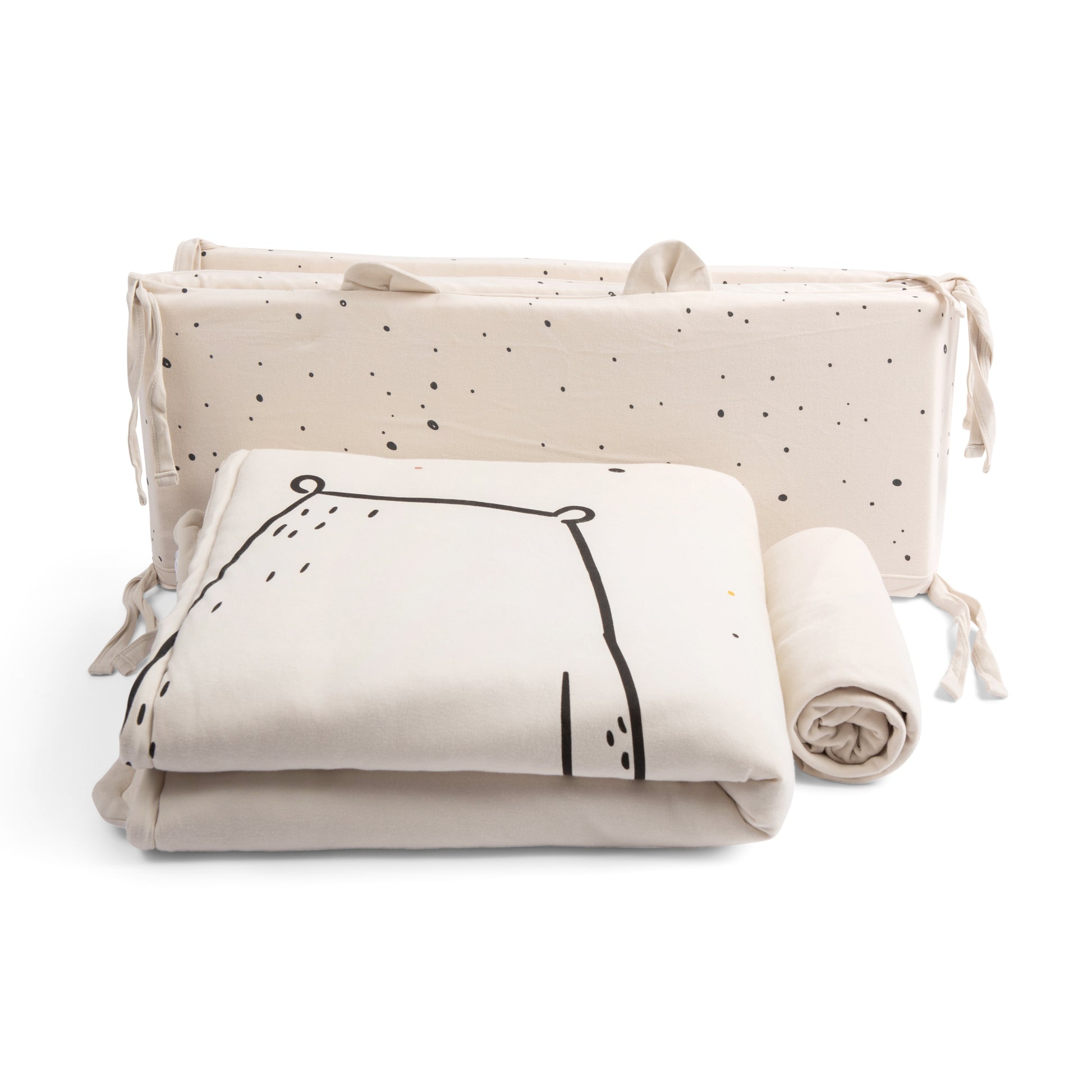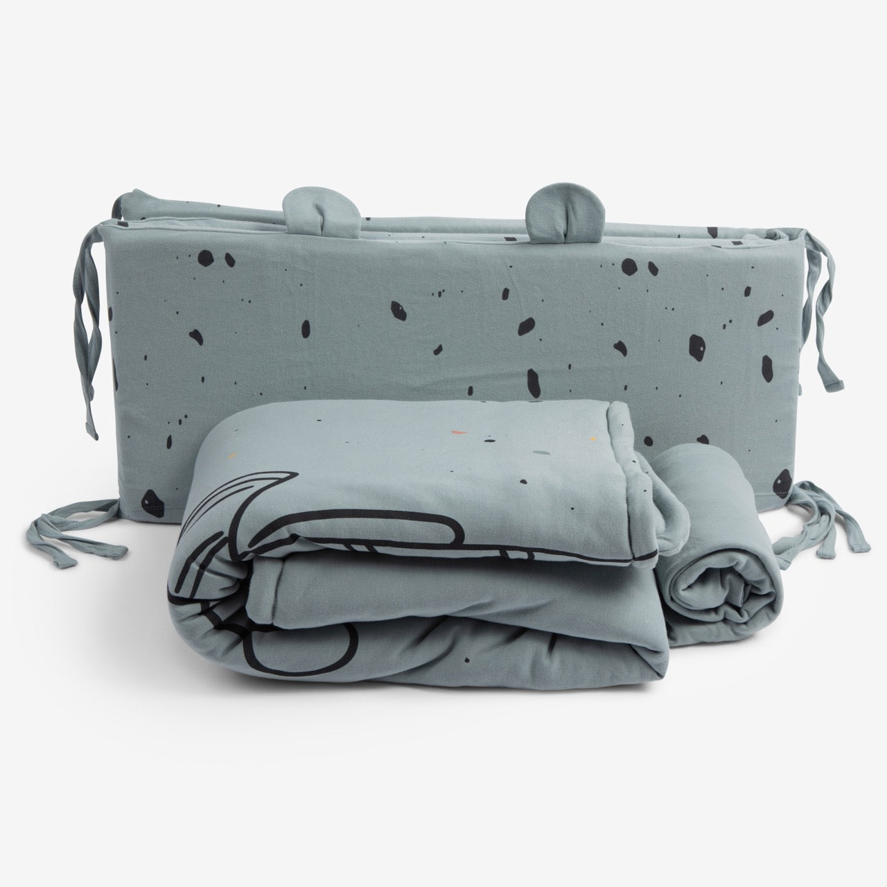 Juego de cama clásico para cuna que incluye: un protector de cabeza de doble cara, cobija de doble cara con relleno multiestacional y una sabana de bebé.