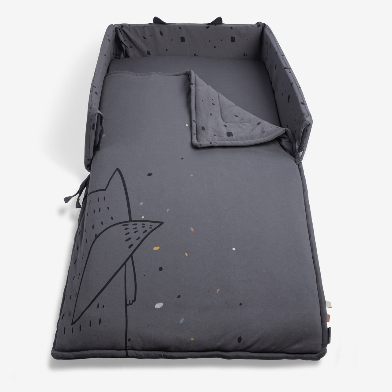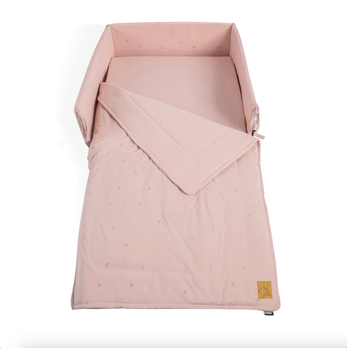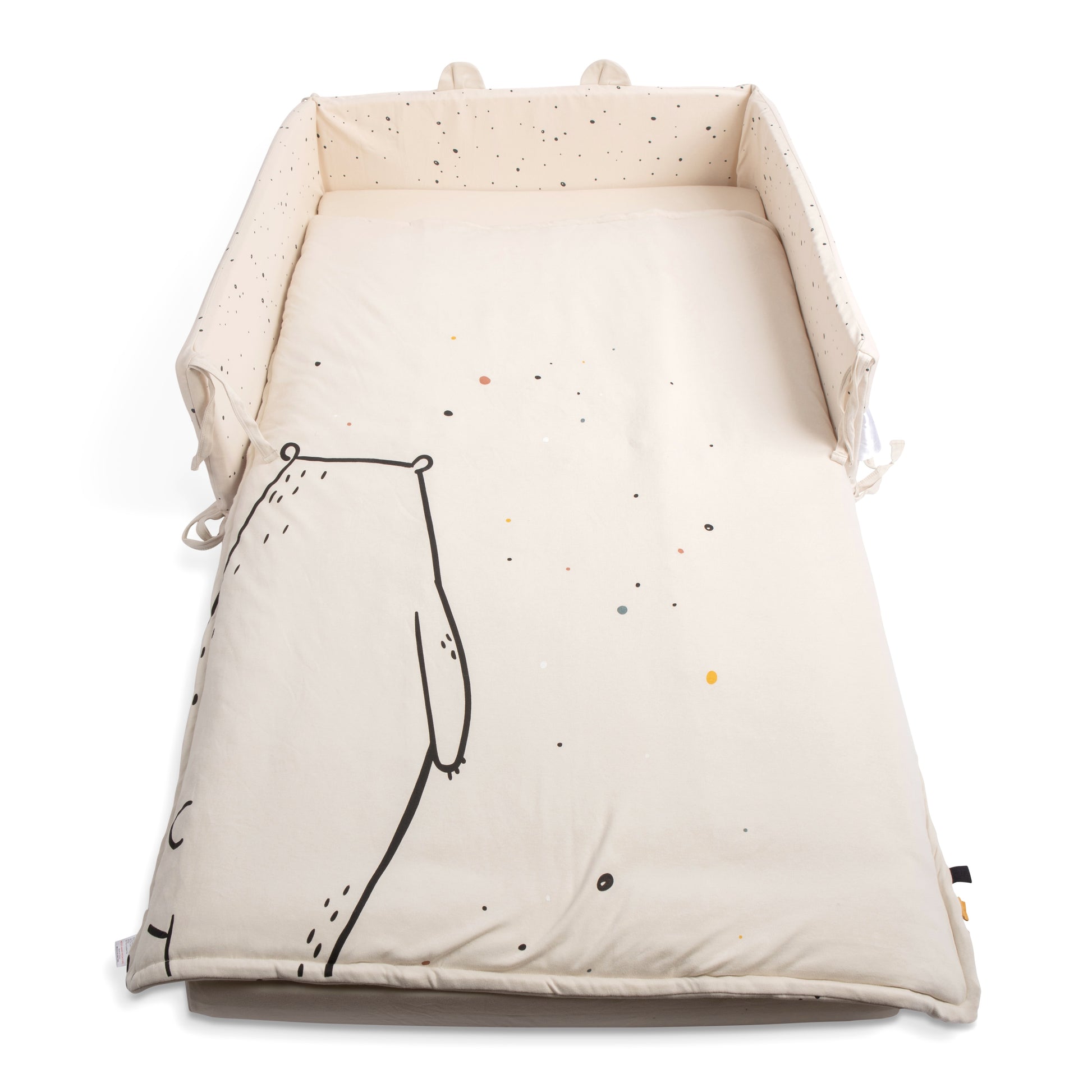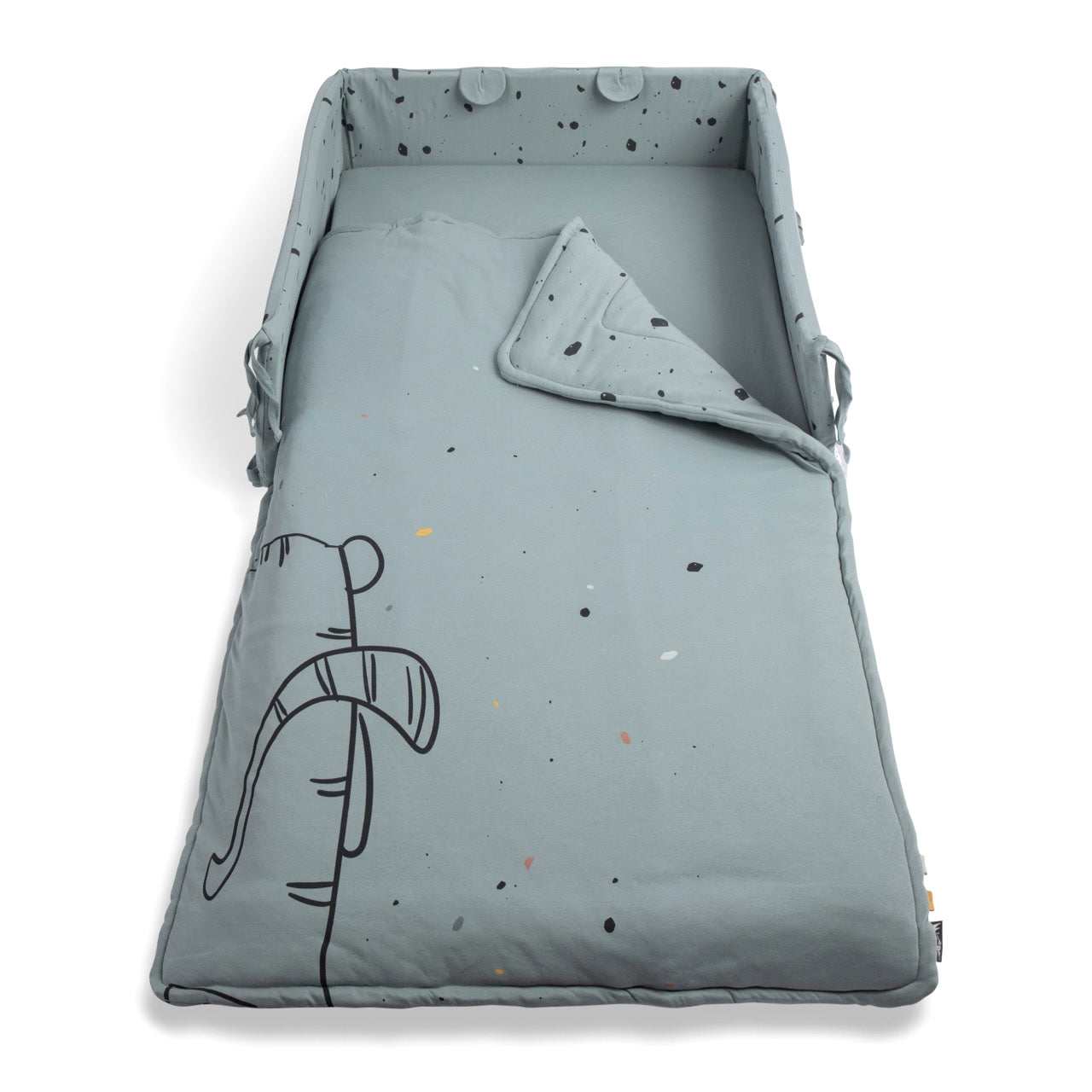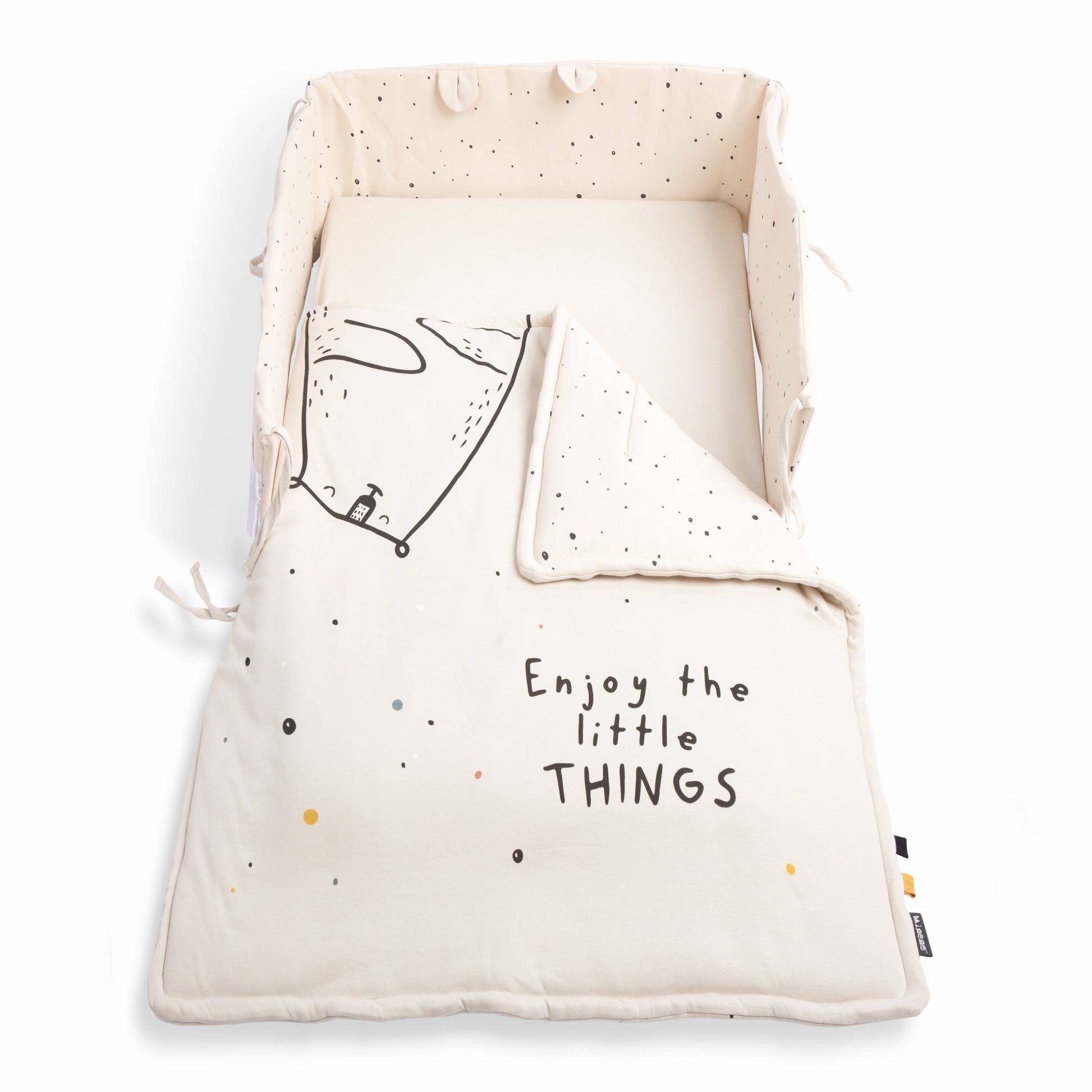 Juego de cama clásico para cuna que incluye: un protector de cabeza de doble cara, cobija de doble cara con relleno multiestacional y una sabana de bebé.